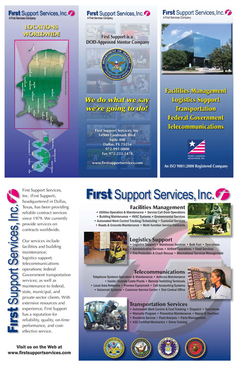 This was a major redesign of the company brochure for First Support Services. I took the digital photo of the building for the front panel, which was designed to have a white border. I created the vector version of the ISO company's logo in Illustrator using a lo-res JPEG as a template.