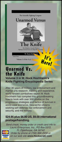 This ad was designed to announce the impending release of the third book in Hock's Knife Fighting Encyclopedia series. The ad was for publication in other magazines such as Combat Handgun and others. A B&W version was done later in which the camoflage background was dropped out. |